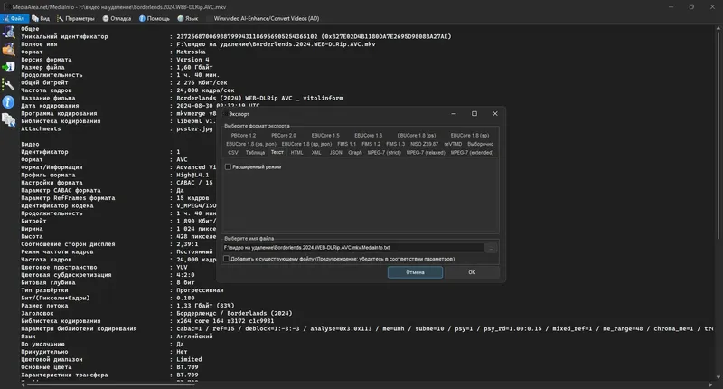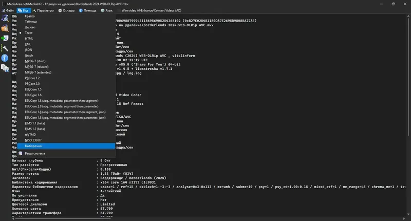 Для анализа файла достаточно просто перетащить его в окно программы или выбрать через меню. В интерфейсе отображается подробная информация о файле, разбитая на категории: видео, аудио, субтитры и части. Можно выбрать предпочитаемый способ отображения — текст, дерево или HTML — и экспортировать полученные данные для дальнейшего использования. Программа также поддерживает работу через командную строку, что удобно для автоматизации процессов. Современные версии совместимы с Windows 10 и позволяют скачать программу на русском языке, что делает её доступной для широкого круга пользователей.