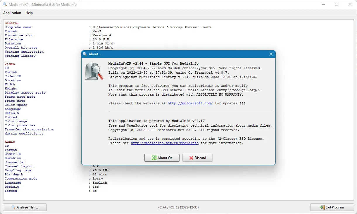 MediaInfoXP — это легкий и функциональный инструмент, основанный на проекте MediaInfo, созданный с нуля разработчиком LoRd_MuldeR. Он позволяет быстро и удобно получать полную техническую информацию о видео и аудиофайлах, таких как кодеки, битрейт, разрешение, длительность и другие параметры. Программа распространяется бесплатно и доступна под лицензией GPL или LGPL, что обеспечивает свободный доступ к исходному коду и возможность модификации. MediaInfoXP подходит для работы с различными форматами мультимедиа и отлично интегрируется в рабочий процесс благодаря портативной версии и возможностям встраивания в проводник Windows.