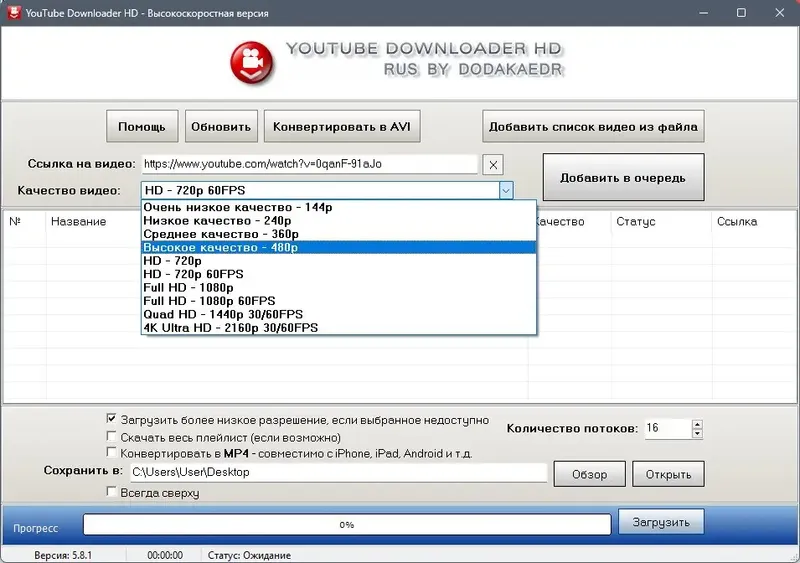 - Запись видео в высоком качестве, включая HD и SD