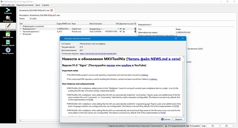 MKVToolNix — это мощный набор инструментов для работы с видеофайлами формата MKV, обеспечивающий удобное редактирование, создание и изменение мультимедийных контейнеров. Эта программа позволяет легко добавлять или удалять звуковые дорожки, субтитры и объединять или разделять видеофайлы, сохраняя высокое качество. Благодаря простому интерфейсу и высокой скорости обработки, MKVToolNix подходит как для профессиональных монтажеров, так и для любителей. Скачать программу можно на официальном сайте или через проверенные источники, что гарантирует безопасность и актуальность версии.