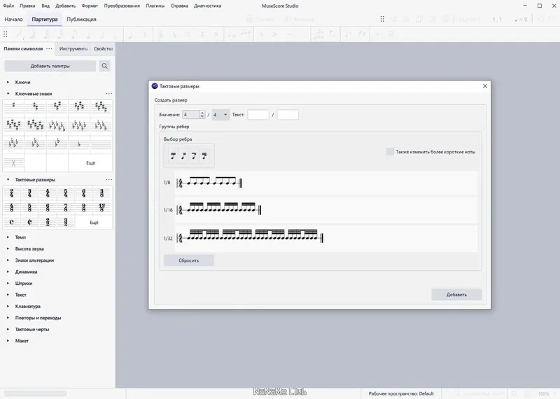 - Поддержка множества инструментов и музыкальных символов, включая арпеджио, глиссандо и знаки динамики.