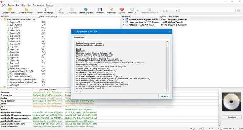 MusicBrainz Picard — это удобная и универсальная программа для редактирования тегов аудиофайлов, которая позволяет легко организовать музыкальную коллекцию, автоматически получать информацию о композициях и сохранять правильные метаданные. Поддерживая широкий спектр форматов, она подходит как для любителей, так и для профессиональных музыкантов, желающих быстро обновить свою медиатеку. Приложение отлично подходит для тех, кто ищет способ быстро и качественно упорядочить музыку, а также для тех, кто хочет скачать программу и научиться ей пользоваться на русском языке бесплатно.
