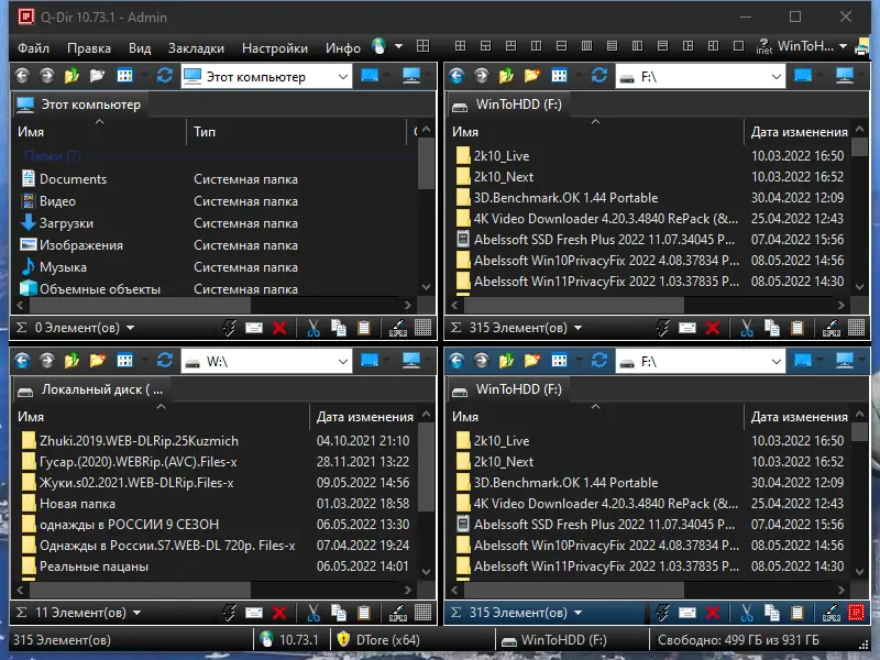 Q-Dir — это современный файловый менеджер, который позволяет одновременно работать с несколькими папками благодаря четырем панелям. Это значительно повышает эффективность, особенно при копировании и перемещении файлов между различными каталогами. В программе реализована поддержка популярных протоколов и форматов, таких как ZIP и FTP, а также возможность работы с сетевыми дисками и ярлыками. Интуитивный дизайн и богатый функционал делают Q-Dir универсальным решением для профессионалов и домашних пользователей.