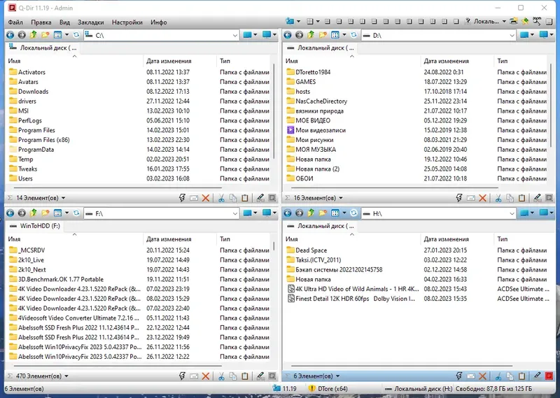 Q-Dir — это универсальный файловый менеджер с уникальным четырехпанельным интерфейсом, который значительно ускоряет работу с файлами и папками. Он поддерживает работу с различными съемными носителями, сетевыми ресурсами и архивами, предоставляя пользователю широкие возможности по организации и управлению файлами. Благодаря многоязычному интерфейсу и удобным функциям, программа подходит как для профессиональных пользователей, так и для обычных пользователей, желающих упростить работу с файлами на компьютере или внешних устройствах.