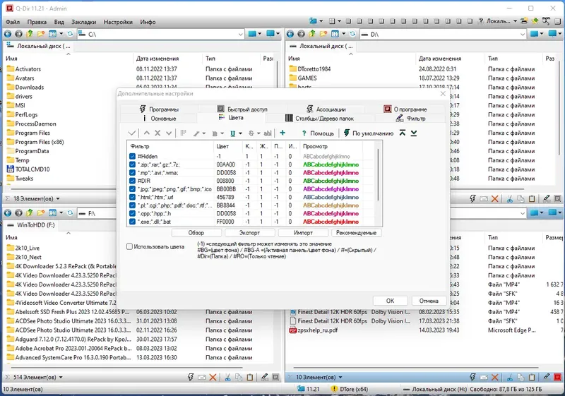 - Настройка цветовых меток для быстрого определения типов файлов и фильтрация содержимого.