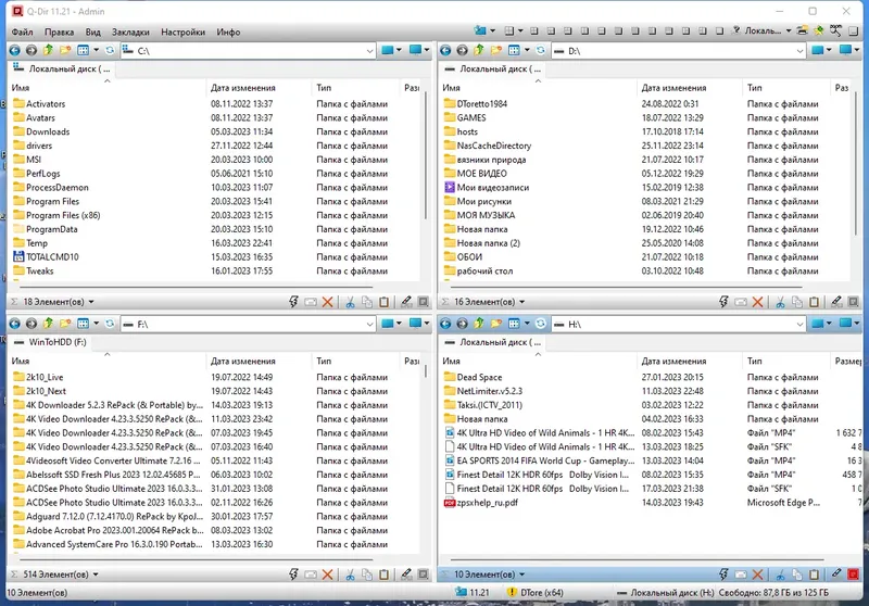 - Многофункциональный четырехпанельный интерфейс для одновременного просмотра и управления файлами.