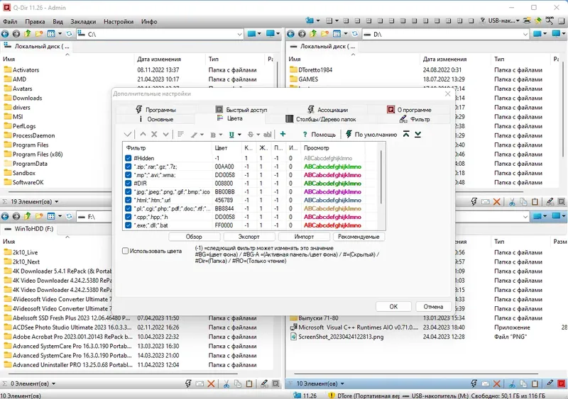 - Настройка цветов для определенных расширений файлов для быстрого распознавания