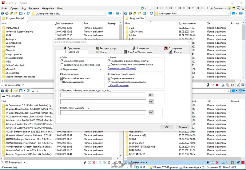 Q-Dir — это универсальный файловый менеджер с уникальным четырехпанельным интерфейсом, который значительно ускоряет работу с файлами и папками. Он поддерживает работу с различными типами хранилищ, такими как сетевые ресурсы, FTP, ZIP-архивы и съемные носители. Программа обладает широкими возможностями настройки и предоставляет удобные инструменты для быстрого доступа к часто используемым папкам, фильтрации и предварительного просмотра файлов.