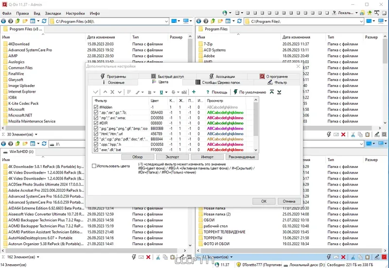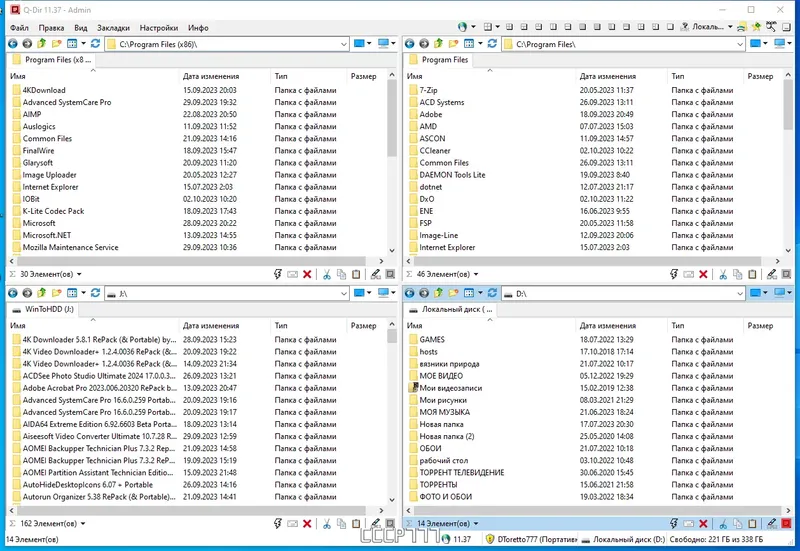 Q-Dir отличается высокой скоростью работы и гибкостью настройки, что делает ее популярной среди пользователей, нуждающихся в эффективной организации мультимедийных коллекций. Ее интерфейс с четырьмя панелями позволяет одновременно управлять несколькими папками, а встроенные инструменты фильтрации и предварительного просмотра значительно ускоряют работу с файлами.