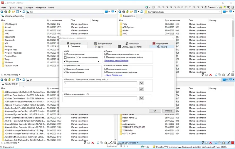 Q-Dir обладает широкими возможностями, которые делают управление файлами более удобным и эффективным. Его интерфейс с четырьмя панелями позволяет одновременно работать с несколькими каталогами, что экономит время и повышает производительность. Поддержка различных форматов экспорта и фильтров делает программу универсальной для профессиональных задач. Однако, для новичков интерфейс может показаться сложным из-за большого количества настроек и функций, а также возможна необходимость привыкания к управлению несколькими панелями одновременно.