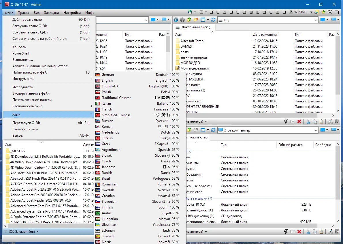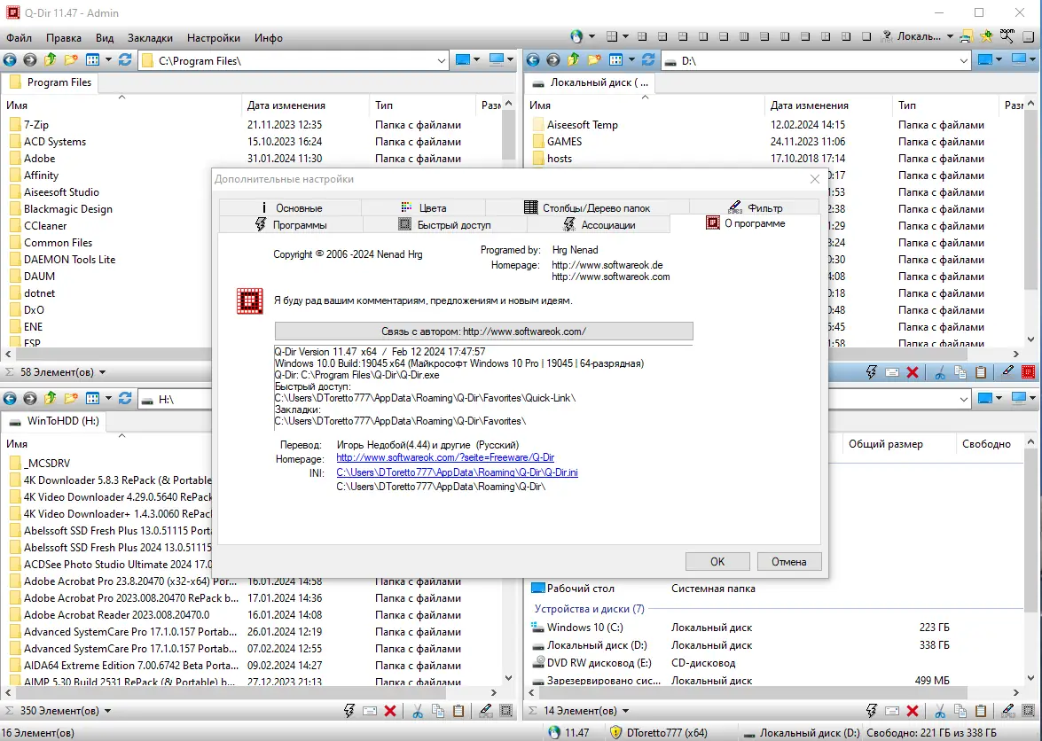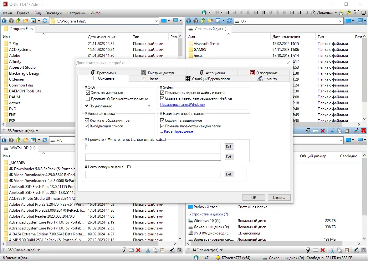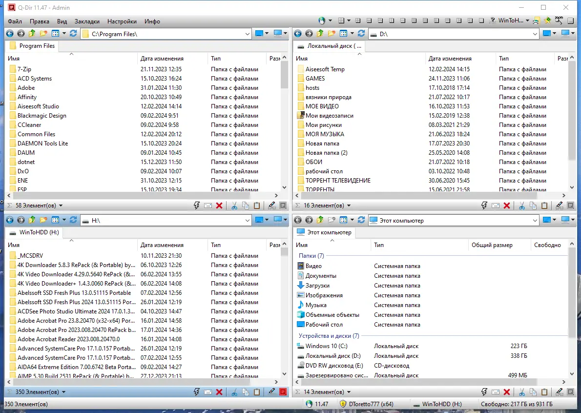 Q-Dir — это многофункциональный файловый менеджер с уникальным четырехпанельным интерфейсом, который значительно упрощает работу с файлами и папками. Он поддерживает работу с любых съемных устройств, обеспечивает быстрый доступ к часто используемым папкам и обладает широкими возможностями по настройке и фильтрации. Благодаря многоязычному интерфейсу программа подходит для пользователей разных стран и языковых предпочтений. Q-Dir идеально подходит для тех, кто ищет удобное решение для управления файлами, просмотра изображений и экспорта данных в различные форматы.