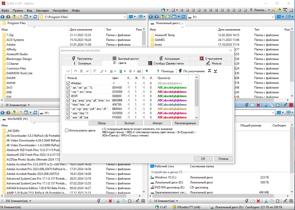 - Настраиваемое выделение файлов цветом по расширениям и типам