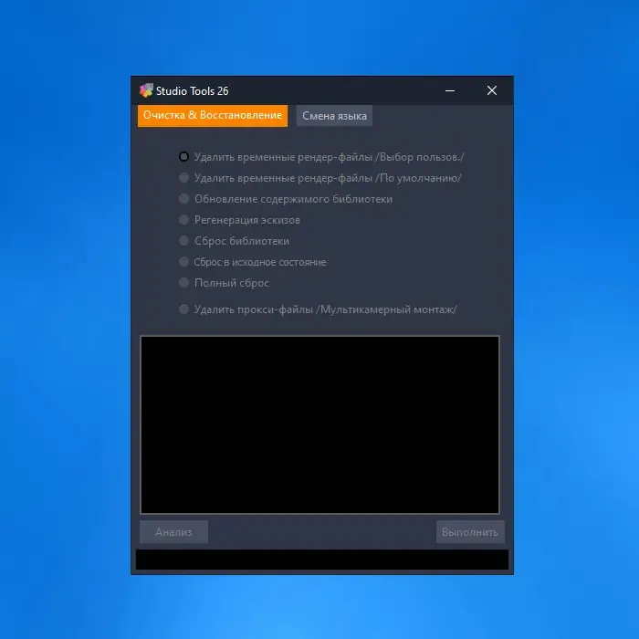 StudioTools — это универсальный помощник для тех, кто работает с Pinnacle Studio 26. Он позволяет быстро очищать временные файлы рендеринга, что освобождает место на диске и повышает производительность системы. Кроме того, программа обеспечивает автоматическое обновление библиотеки и регенерацию эскизов, что способствует более быстрому доступу к проектам и улучшает организацию мультимедийных данных. Также утилита поддерживает смену языкового интерфейса, что делает ее удобной для пользователей из разных стран.