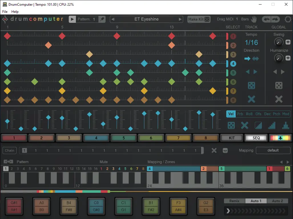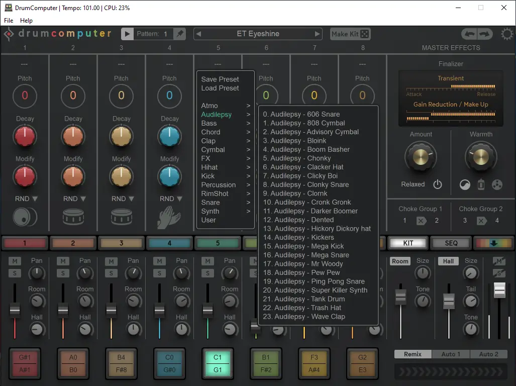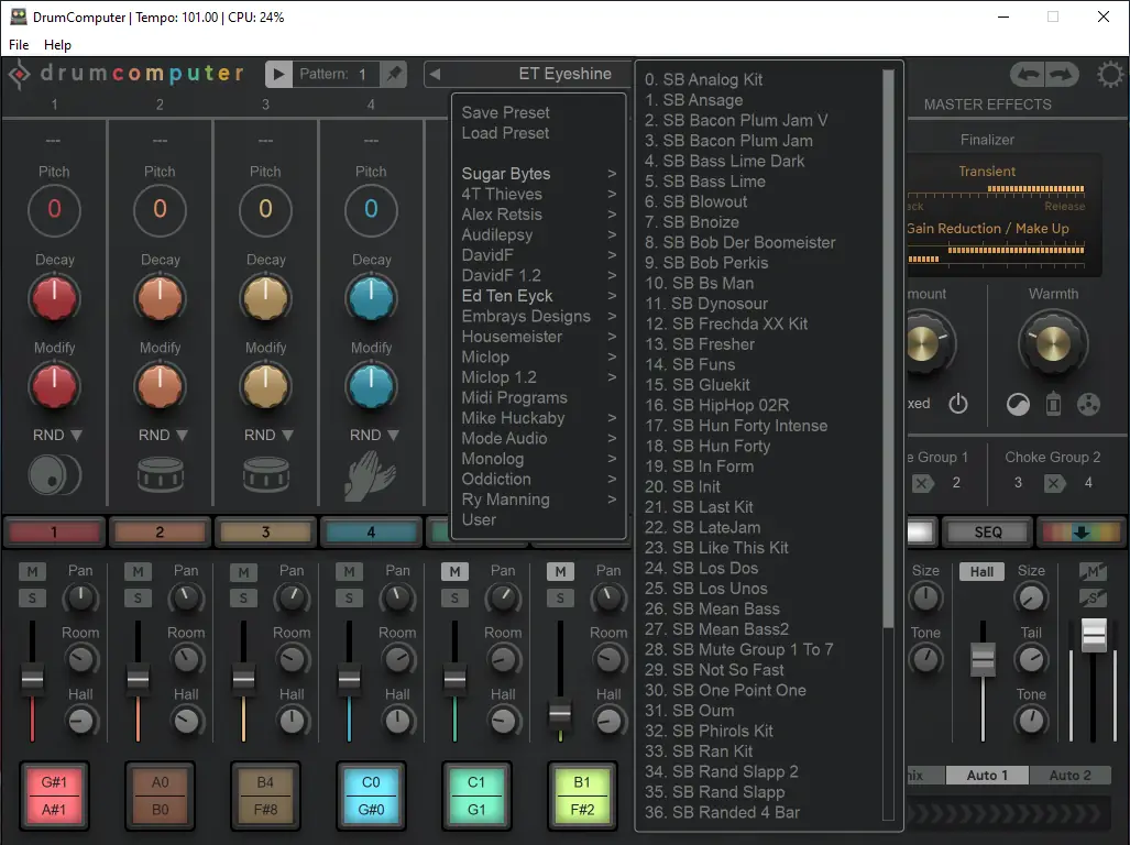 DrumComputer — это современный синтезатор ударных, сочетающий в себе преимущества классического и цифрового звука. Программа включает восемь звуковых двигателей, каждый из которых поддерживает резонаторы, Wavetable и Resynth, что позволяет создавать уникальные ритмы и текстуры. Множество встроенных эффектов, таких как фильтры, компрессоры, овердрайв и реверберации, дают возможность полностью контролировать звучание. Инновационные модуляторы, секвенсоры-модуляторы и автоматические рандомизаторы помогают генерировать бесконечное количество вариаций ударных. Кроме того, программа поддерживает импорт собственных сэмплов, что расширяет творческие возможности.