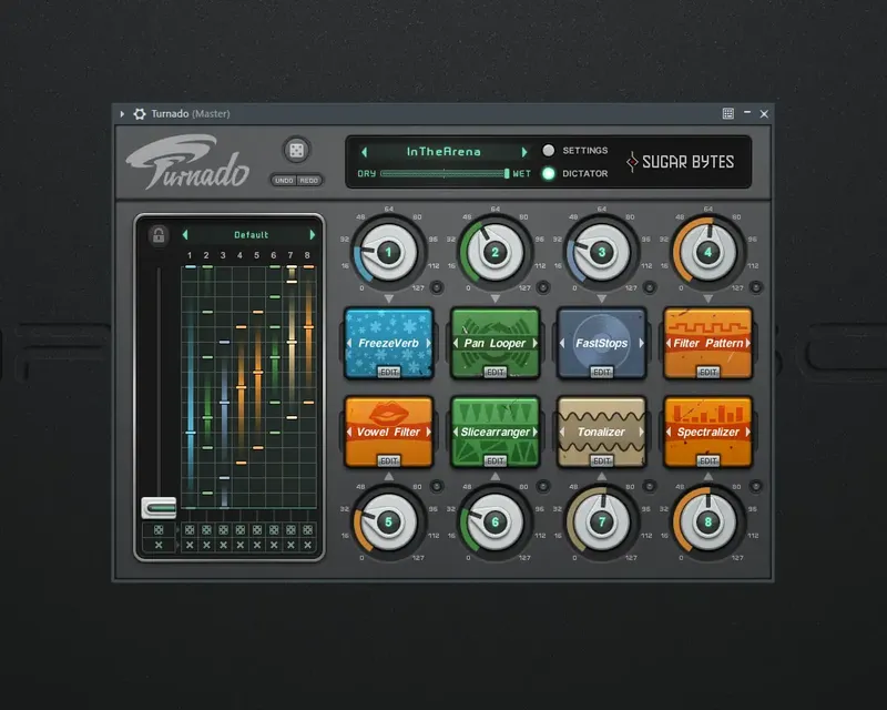 Turnado от Sugar Bytes — это мощный аудио-манипулятор и универсальный vst-плагин для обработки звука в реальном времени. Он идеально подходит как для студийной работы, так и для живых выступлений. В программе реализована богатая коллекция эффектов, которые легко настраиваются и управляются благодаря интуитивному интерфейсу и уникальной системе ручек. Благодаря возможностям автоматизации, MIDI-управления и режиму Dictator, Turnado предоставляет широкие возможности для творчества и экспериментов с аудио.