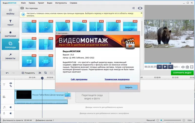 ВидеоМОНТАЖ — это универсальный и доступный видеоредактор, который идеально подходит для создания ярких и профессиональных видеороликов в домашних условиях. Программа отличается простотой использования и широкими возможностями редактирования, позволяя быстро подготовить качественный контент без специальных навыков. Благодаря интуитивному интерфейсу и богатому функционалу, любой пользователь сможет за минимальное время научиться создавать эффектные видео, добавляя переходы, титры, музыку и спецэффекты.
