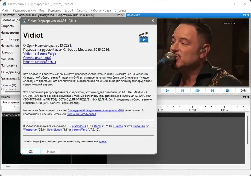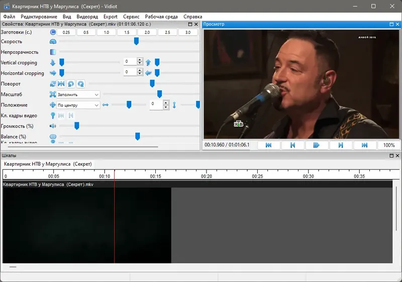 Vidiot — это бесплатный и простой в использовании нелинейный видеоредактор, который подойдет как новичкам, так и опытным пользователям. Он позволяет легко редактировать видео, добавлять эффекты, переходы и настраивать параметры для получения качественного конечного результата. Благодаря поддержке многочисленных форматов, программа обеспечивает универсальность и удобство при работе с различными типами медиафайлов.
