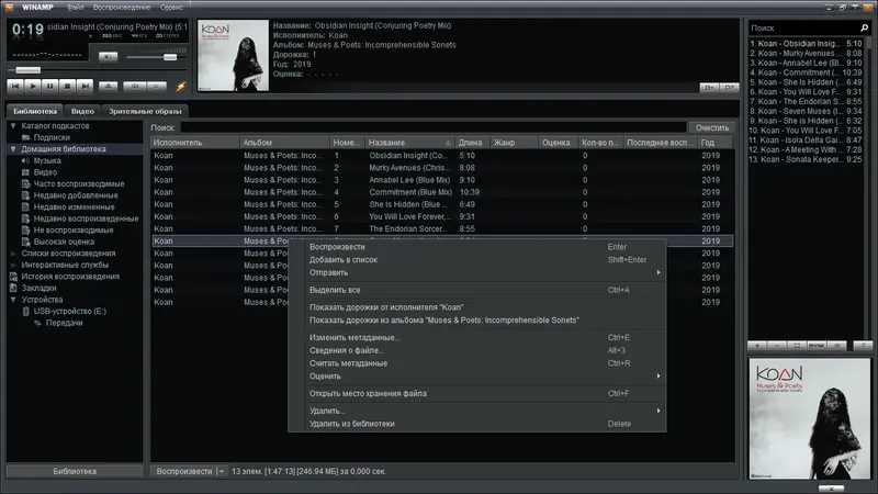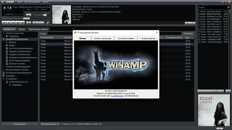 Winamp — это обновлённый мультимедиаплеер, объединяющий в себе классический дизайн и современные технологии. Он поддерживает воспроизведение множества форматов аудио и видео, включая MP3, OGG, AAC, WAV, MOD, XM, S3M, IT и MIDI. Программа предлагает широкие возможности настройки интерфейса, смену скинов, модуль визуализации и интеграцию с медиа-библиотеками. Благодаря постоянным обновлениям, Winamp остается актуальным и совместимым с последними версиями Windows, такими как Windows 10 и Windows 11. Это универсальный проигрыватель, который подойдет как для прослушивания музыки, так и для просмотра видеоконтента, а также для прослушивания подкастов и радиостанций.