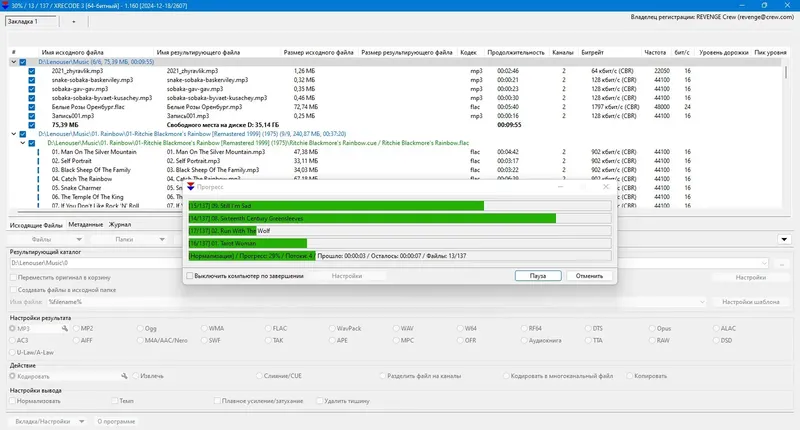XRecode — это современный мультимедийный конвертер, который поддерживает большинство популярных аудиоформатов, таких как MP3, FLAC, WAV, OGG, APE, а также видеоформаты, включая MP4, AVI и MKV. Программа отличается высокой скоростью обработки благодаря использованию многоядерных процессоров и поддержке параллельного конвертирования. Она позволяет извлекать аудио из видеофайлов, граббить многоканальные аудиодорожки с CD и создавать единый аудиофайл из нескольких источников. Встроенный редактор метаданных с возможностью добавления обложек и автоматической обработки тегов делает работу с файлами ещё удобнее. Поддержка командной строки расширяет возможности автоматизации задач, а портативная версия позволяет запускать программу без установки, что удобно при работе на различных устройствах.