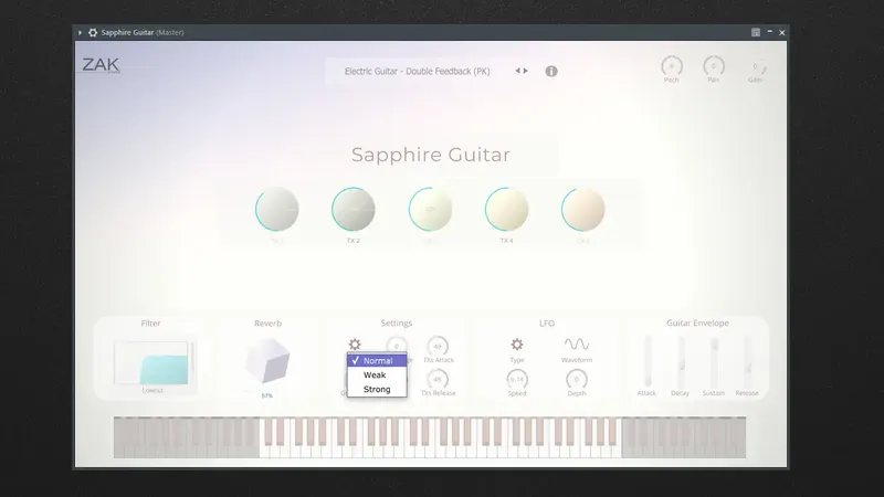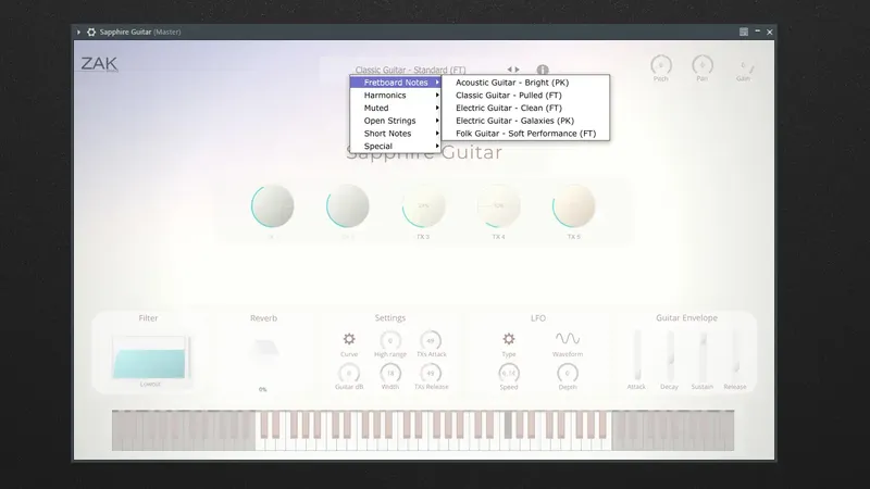 Знакомство с ZAK Sound — Sapphire Guitar открывает перед музыкантами и продюсерами новые возможности для создания уникальных гитарных звуков. Этот плагин предназначен для тех, кто ищет нестандартные инструменты для выражения эмоций через музыку, сочетая богатство акустических и электрических звуков с разнообразными эффектами. Благодаря широкому спектру настроек и оригинальным сэмплам, Sapphire Guitar позволяет добиться тонких нюансов и глубины в музыкальных композициях.