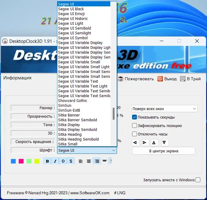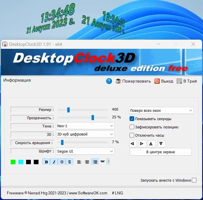 DesktopClock3D — это стильные и настраиваемые 3D часы для рабочего стола Windows, которые позволяют украсить интерфейс компьютера и повысить удобство работы. Программа предлагает широкий выбор шрифтов, тем и индивидуальных настроек, что делает отображение времени максимально привлекательным и функциональным. Благодаря легкости и низкому потреблению ресурсов, она идеально подходит для пользователей, ищущих красивое и практичное решение для отображения времени на экране.