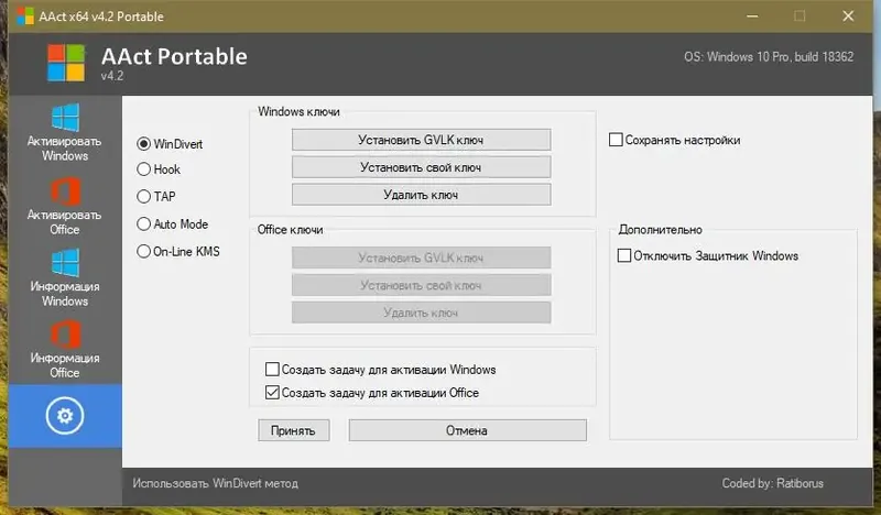 AAct — это мощный активатор для Windows, предназначенный для автоматической активации различных редакций операционных систем и офисных программ. Программа работает без необходимости установки и не требует дополнительных компонентов, таких как .NET Framework. Ее можно скачать в портативной версии, что делает ее удобной для использования на разных устройствах и системах. AAct поддерживает как 32-битные, так и 64-битные платформы, обеспечивая быстрый и надежный процесс активации.