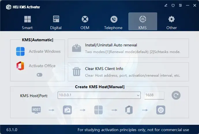 HEU KMS Activator — это мощный инструмент для активации Windows и Office, который подходит как для домашних пользователей, так и для профессионалов. Он автоматически определяет оптимальный метод активации и предлагает пользователю выбрать наиболее подходящий канал: цифровая лицензия, KMS38, OEM или KMS. Благодаря простому интерфейсу и множеству функций программа обеспечивает надежную и быструю активацию без необходимости приобретения ключей или обращения в сервисные центры.