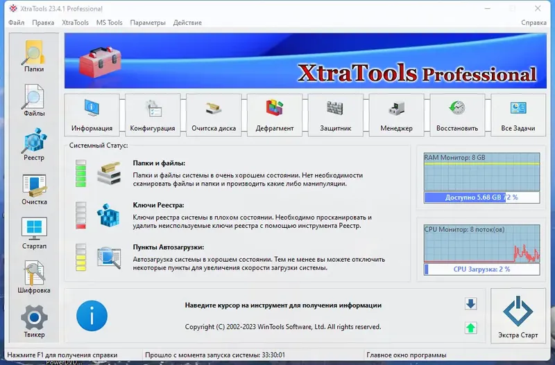 - Удобный интерфейс с темной темой и гаджетами