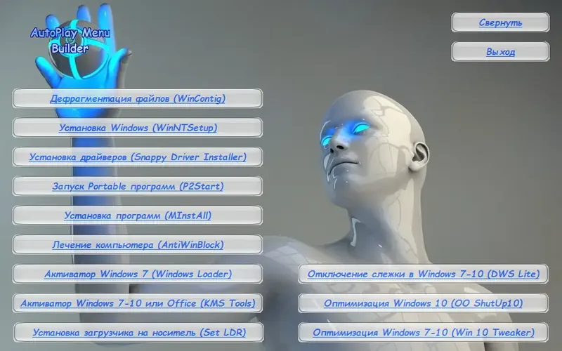 - Удобное меню автоматического запуска и обновления сборки