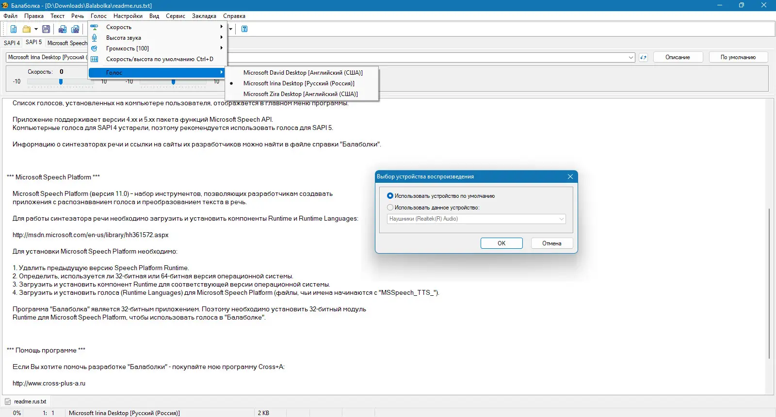 Balabolka — это мощная и удобная программа для чтения текстовых файлов вслух с помощью синтезатора речи. Она подходит для создания озвучки, прослушивания документов и работы с различными форматами файлов. Благодаря поддержке голосов с нейросетью и возможностям онлайн-озвучивания, программа обеспечивает качественное и естественное воспроизведение текста на русском и других языках.