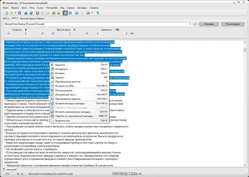 Balabolka позволяет использовать голосовые движки Windows и сторонние TTS-сервисы, что обеспечивает высокое качество озвучки и возможность выбора различных голосов, включая нейросетевые модели.