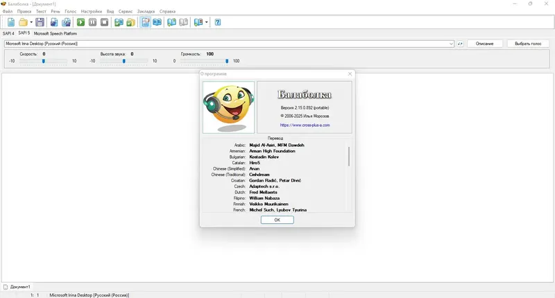 Balabolka — это универсальный читалка, предназначенная для преобразования текста в речь с помощью встроенных или сторонних синтезаторов. Она поддерживает широкий спектр форматов файлов, таких как PDF, EPUB, DOCX, FB2, MOBI, а также популярные аудиоформаты WAV, MP3 и WMA. Возможность скачивать голосовые движки, включая нейросеть озвучка, делает программу особенно актуальной для пользователей, стремящихся к максимально естественному звучанию. Встроенные функции позволяют управлять скоростью, высотой и тембром голоса, а также сохранять озвученные тексты в аудиофайлы для дальнейшего использования.