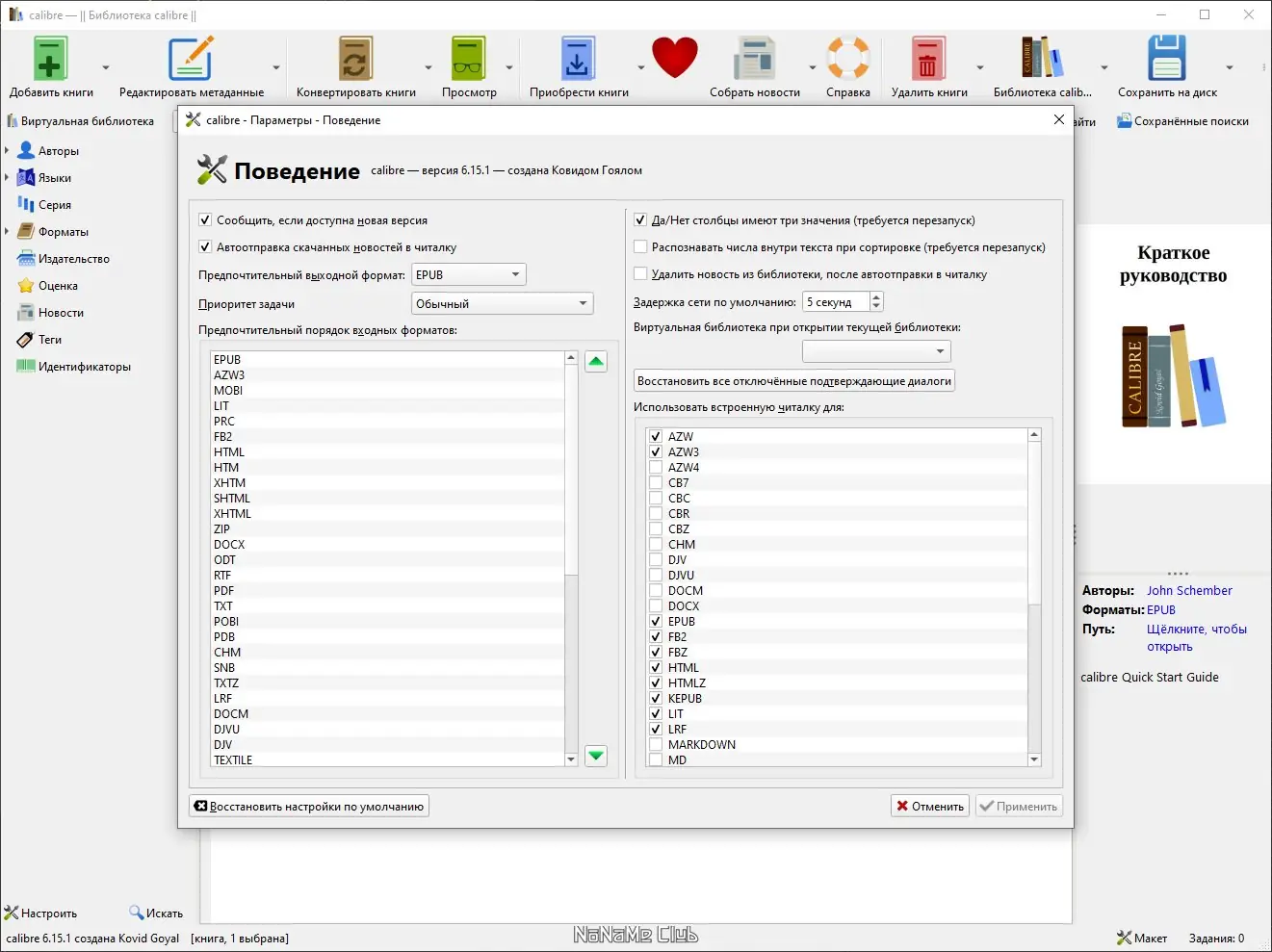 - Конвертация книг между популярными форматами, такими как EPUB, MOBI, PDF и другими