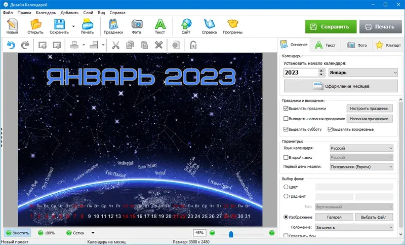 Дизайн Календарей предоставляет широкий набор инструментов для оформления календарей, включая возможность добавления фотографий, выбора шаблонов, настройки шрифтов и цветов. В программе реализована функция редактирования праздничных дней и их группировки по категориям, что значительно упрощает подготовку тематических календарей. Встроенная коллекция шаблонов и фонов позволяет создавать календари в различных стилях, а экспорт в популярные форматы обеспечивает удобство печати и распространения.