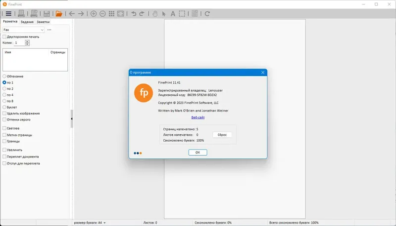 FinePrint — это многофункциональный драйвер для принтеров, который значительно расширяет возможности стандартной печати. Он позволяет выполнять предпросмотр документов, печатать несколько страниц на одном листе, создавать брошюры, вставлять заголовки и подвала, а также разрабатывать фирменные бланки и рамки. Программа подходит для всех моделей принтеров и обладает удобной графической оболочкой, что делает управление печатью простым и эффективным. Благодаря возможности использования виртуальных принтеров, FinePrint помогает снизить затраты на расходные материалы и повысить производительность при печати.