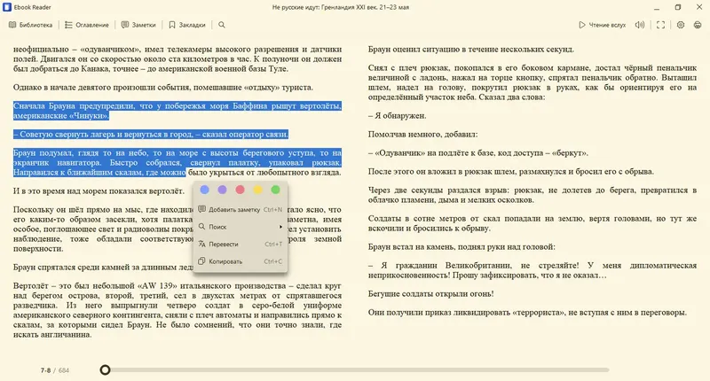 - Встроенные инструменты для заметок, закладок и перевода