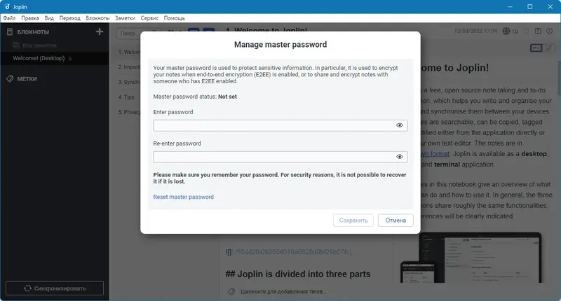 Joplin обеспечивает высокую степень защиты данных и простоту в использовании, что делает его популярным среди пользователей, ищущих надежный редактор заметок.