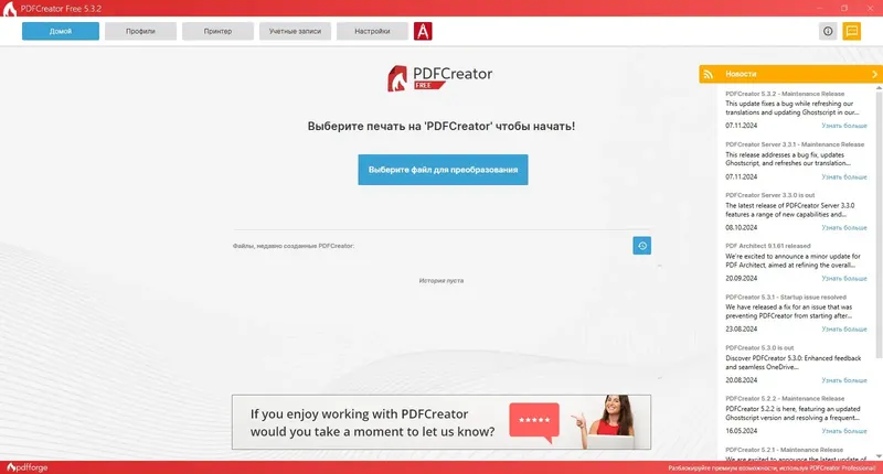 PDFCreator — это мощный редактор для создания файлов PDF и других графических форматов, таких как JPG, PNG, TIFF и BMP. Он позволяет быстро и легко преобразовывать документы из любых программ, поддерживающих функцию печати, в качественные PDF-отчёты и файлы, которые удобно сохранять, отправлять по электронной почте или загружать на серверы. Инструмент обладает расширенными возможностями защиты документов, включая шифрование и установку паролей, что обеспечивает безопасность конфиденциальных данных. Кроме того, PDFCreator позволяет автоматизировать процесс сохранения, объединять несколько файлов в один PDF, а также использовать его в локальной сети для совместной работы сотрудников.