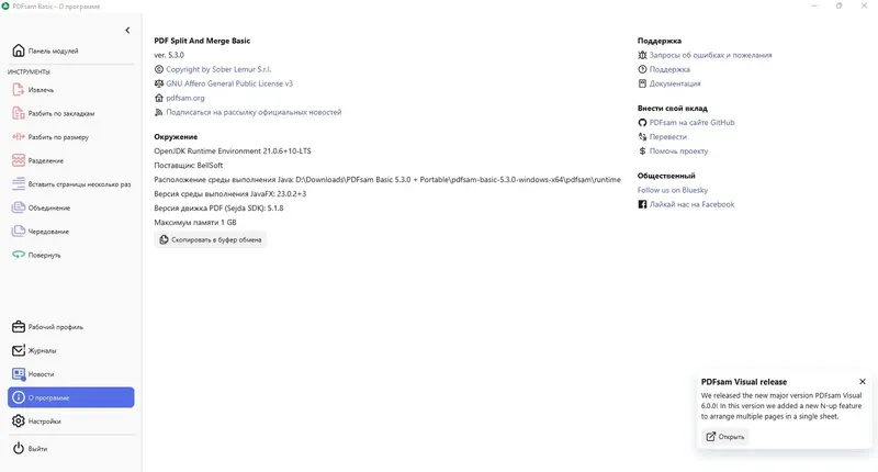 PDFsam — это мощный редактор PDF, который предоставляет широкий спектр возможностей для работы с документами. Он позволяет легко делить большие файлы на части, объединять несколько файлов в один, а также производить различные операции с отдельными страницами. Программа отличается простотой использования и поддержкой русского языка, что делает её доступной для широкой аудитории. Благодаря наличию функций визуального перетаскивания страниц и поддержки командной строки, работа с PDF становится максимально гибкой и быстрой.