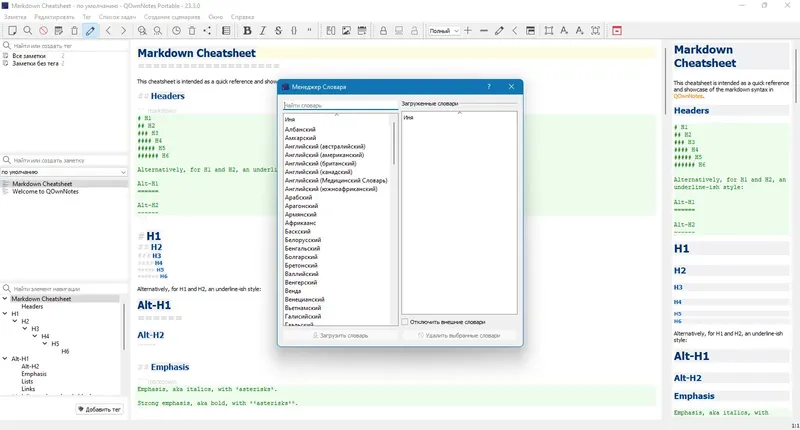 QOwnNotes — это универсальный редактор заметок, который помогает пользователям эффективно организовать свои записи. Встроенные функции сортировки, поиска и навигатора по заголовкам делают работу с большими объемами информации максимально удобной. Программа поддерживает синхронизацию с облачными хранилищами, такими как ownCloud, Nextcloud и Dropbox, что обеспечивает доступ к заметкам с различных устройств, включая мобильные. Использование формата Markdown позволяет легко форматировать текст, добавлять списки, ссылки и изображения без необходимости сложных настроек. Встроенная поддержка скриптов и темной темы оформления делают работу с программой более комфортной и индивидуальной.