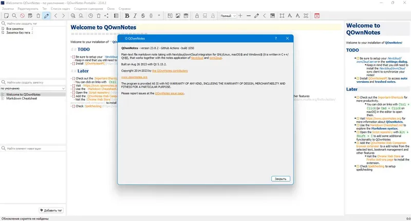 QOwnNotes — это универсальный менеджер заметок, предназначенный для эффективной организации информации в виде простых текстовых файлов. Программа позволяет удобно создавать, редактировать и синхронизировать заметки через облачные хранилища, такие как ownCloud, Nextcloud и Dropbox. Благодаря поддержке Markdown и расширенным функциям поиска, пользователи могут быстро находить нужную информацию и оформлять записи в удобном формате. QOwnNotes не требует установки и может работать как портативное решение, что делает его особенно привлекательным для тех, кто ценит мобильность и простоту использования.