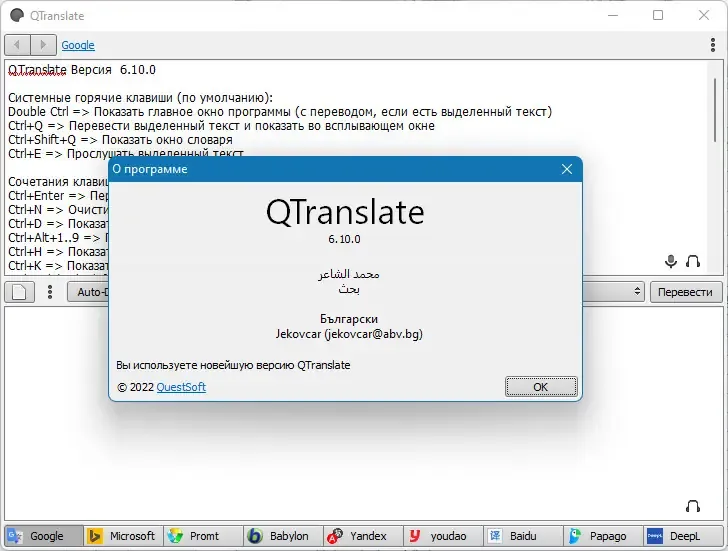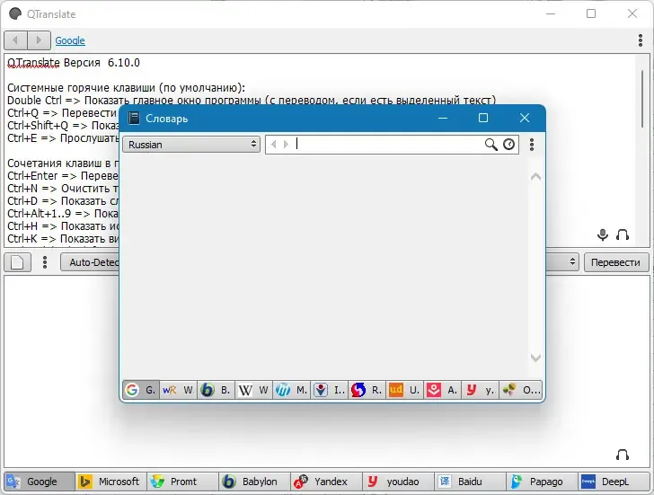 QTranslate — это легкий и многофункциональный переводчик, который позволяет переводить выделенный текст или вводить его вручную через главное окно. Он поддерживает множество популярных онлайн-сервисов, таких как Google, DeepL, Yandex и другие, что обеспечивает широкий выбор источников для перевода. Программа отлично подходит для тех, кто часто работает с иностранными текстами, документами и электронными письмами, а также для изучающих языки и переводчиков.