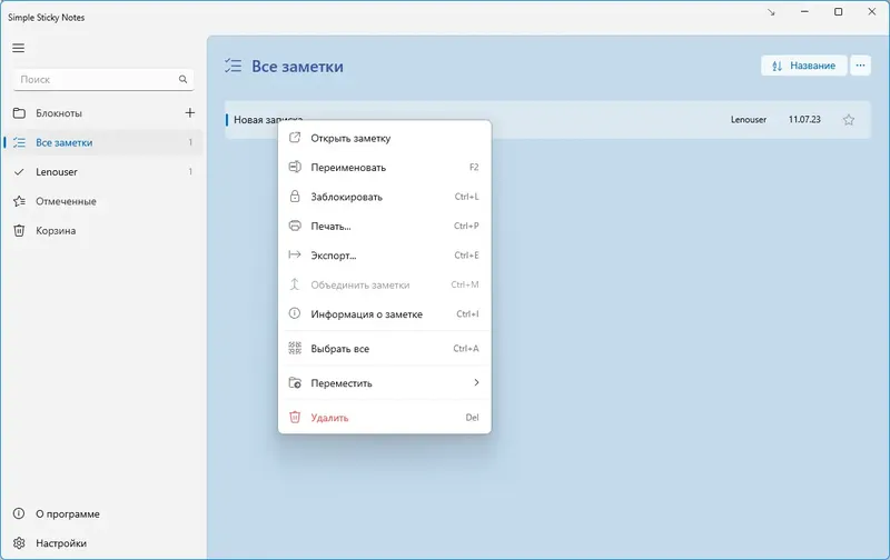 - Экспорт заметок в форматы .txt и .rtf, а также их распечатка.