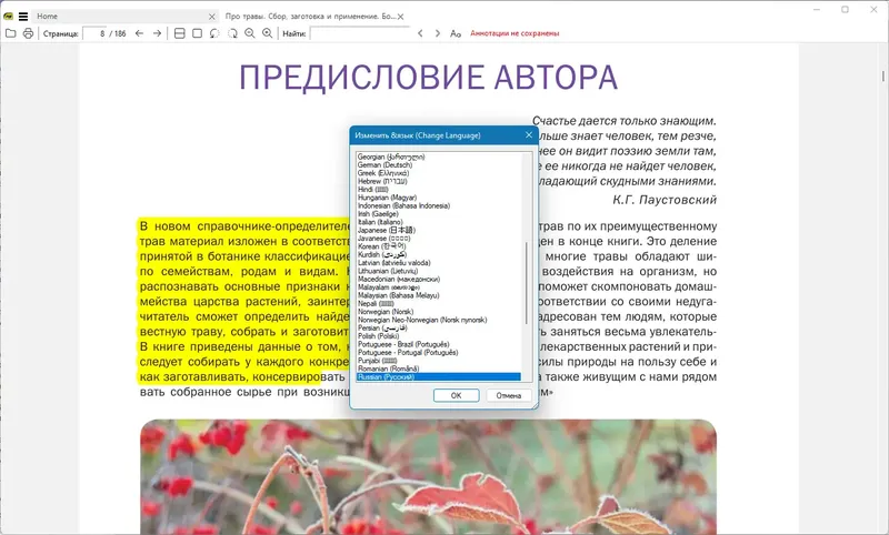 - Поддержка множества форматов документов, включая PDF, ePub и MOBI.