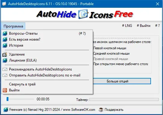 Для использования программы достаточно запустить её и выбрать желаемый жест мыши — клик по свободной области рабочего стола. После этого иконки будут скрываться или появляться в соответствии с выбранной командой. Также можно настроить автоматическое скрытие элементов по таймеру, указав интервал времени. В настройках программы доступны дополнительные параметры, позволяющие адаптировать работу утилиты под индивидуальные предпочтения. После завершения настройки программа работает в фоновом режиме, обеспечивая быстрый доступ к управлению интерфейсом без необходимости постоянного взаимодействия с настройками.