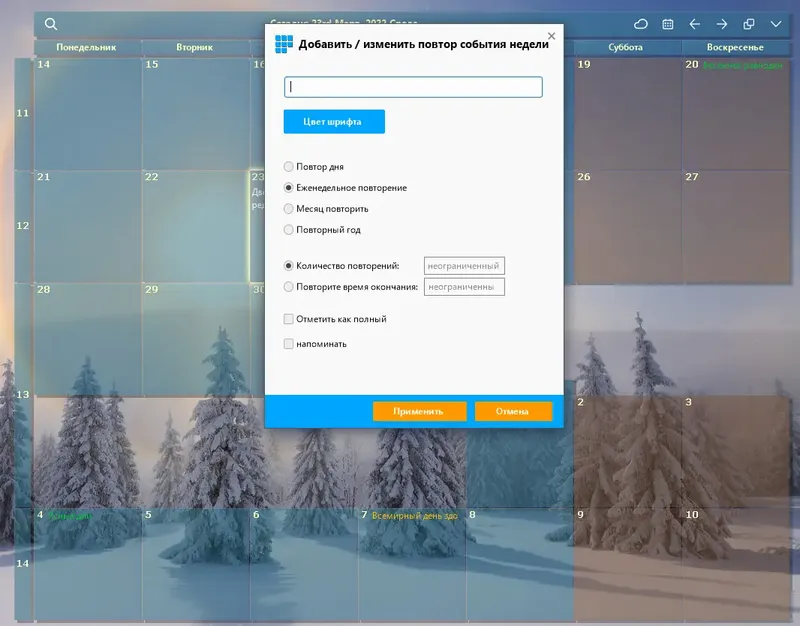 Desktop Calendar представляет собой современный календарь для Windows, который не только отображает текущие даты, но и расширяет возможности стандартных календарных приложений. Пользователи могут вести заметки, отмечать важные события, устанавливать напоминания и выделять особые дни цветом. Эта программа отлично подходит для активных пользователей, которым важно иметь быстрый доступ к информации и эффективно управлять своим временем.