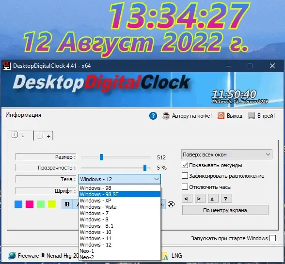 DesktopDigitalClock — это легкое и стильное приложение для отображения цифровых часов на рабочем столе. Оно позволяет выбрать из множества тем оформления и настроить отображение по своему вкусу, не нагружая систему. Простое в использовании и не требующее установки, оно идеально подходит для тех, кто ценит функциональность и минимализм.