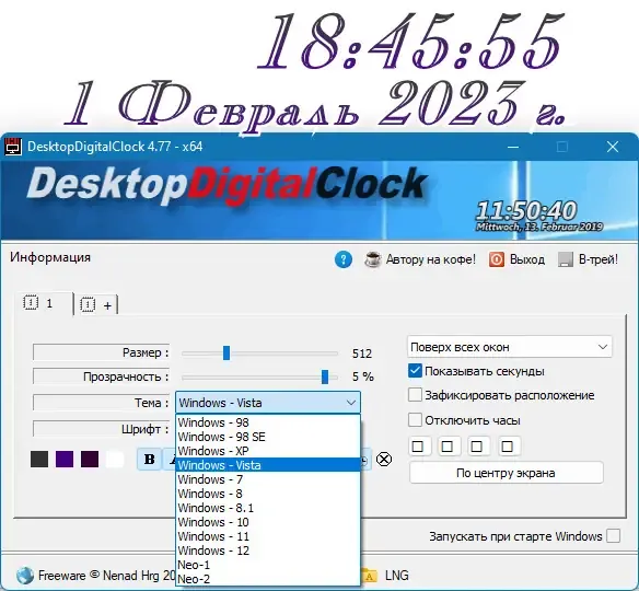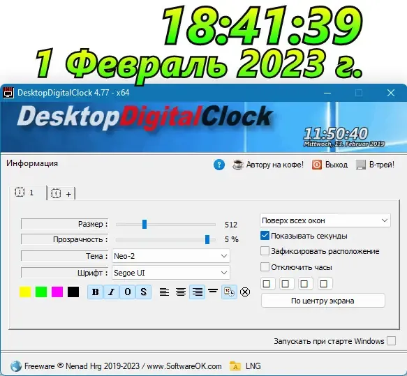 DesktopDigitalClock — это легкое и стильное приложение для отображения цифровых часов на рабочем столе. Программа предлагает широкий выбор тем оформления, настройку прозрачности, шрифтов и положения часов, что позволяет адаптировать внешний вид под любые предпочтения. Благодаря минимальному потреблению системных ресурсов, она идеально подходит для пользователей, желающих иметь всегда актуальное время без нагрузки на систему.