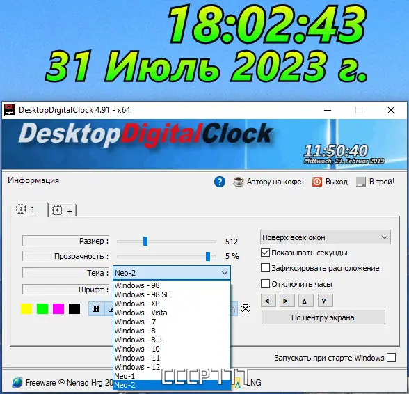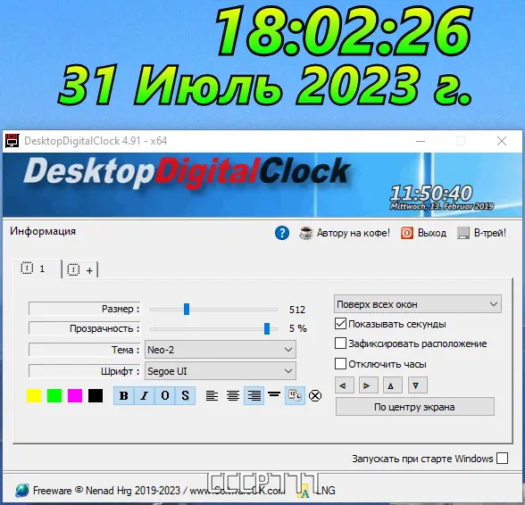 DesktopDigitalClock представляет собой универсальное приложение для отображения цифровых часов на рабочем столе. Оно обладает широкими возможностями по настройке внешнего вида, включая сменные темы, изменение шрифтов и цветов, а также регулировку прозрачности. Программа не требует установки, что делает её удобным инструментом для быстрого внедрения в любой рабочий процесс. Она позволяет выбрать оптимальное расположение часов, зафиксировать их в центре или разместить в любой части экрана, что повышает комфорт использования. Благодаря низкому потреблению ресурсов, программа не замедляет работу системы и подходит для любых устройств.