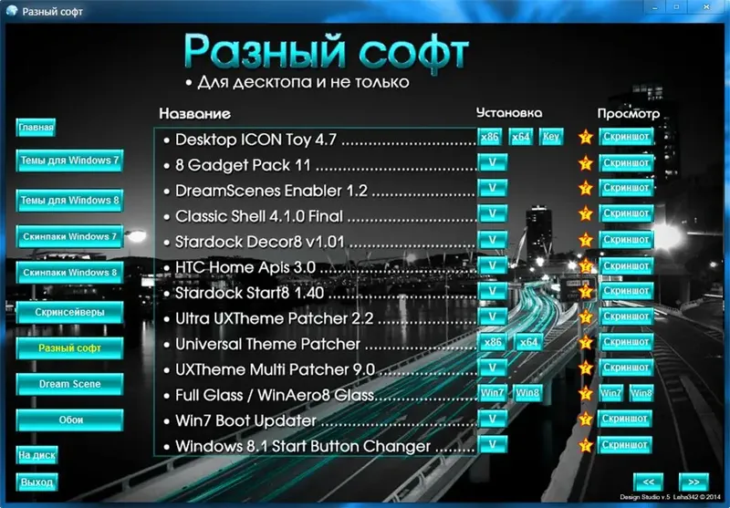 Для начала работы с программой достаточно выбрать интересующую тему или обои из каталога, после чего кликнуть по ней для автоматической установки. В разделе «Разный софт» представлены утилиты для изменения системных файлов, поддержки сторонних тем и добавления прозрачности окон. Все компоненты расположены по категориям, что позволяет быстро найти нужный элемент и применить его одним кликом. Также есть возможность просмотра скриншотов и описаний перед установкой, что значительно упрощает выбор и настройку интерфейса.